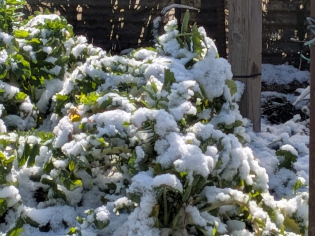 ひと月以上雨がなく、水分不足だった我が家の野菜たちも雪解け水で少しは潤ってくれたかなあ。