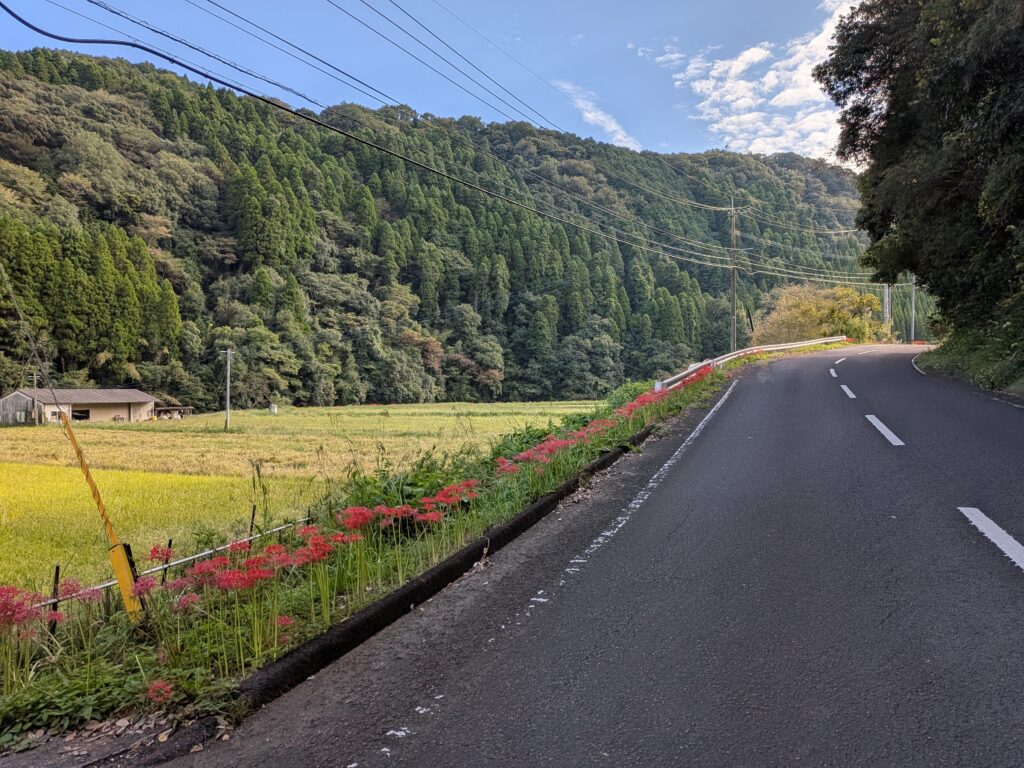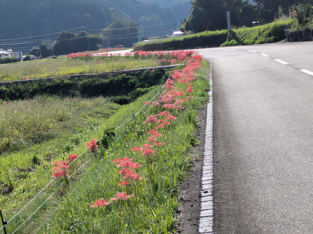 彼岸花の名所はたくさんありますが、犬飼町長谷地区の県道沿いも見事なものですよ。