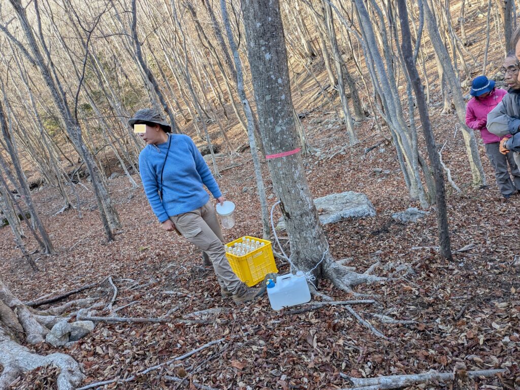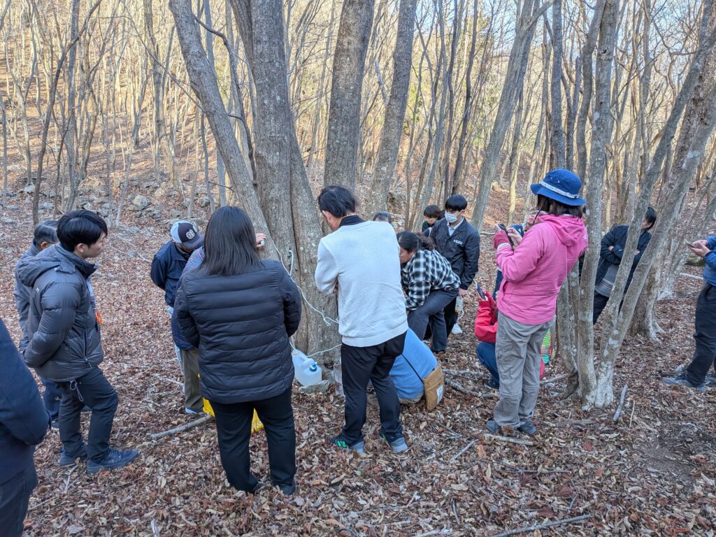 視察は、宇目町の山林で楓の樹液を採るグループの作業見学でした。