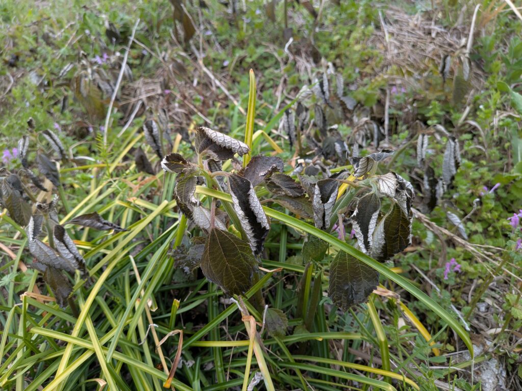 写真は霜萎えたカラムシの葉っぱです。