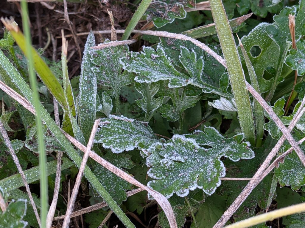 ヨモギの葉っぱに降りた初霜 👆