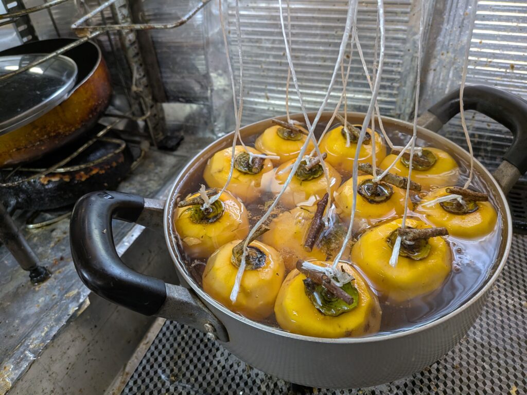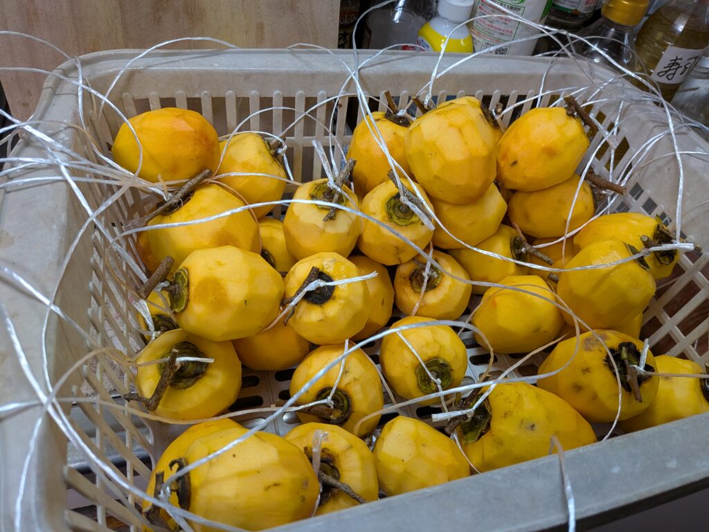 鈴なりになった枝から80個ほどを捥いで、皮を剥いて、熱湯に潜らせ、軒下に吊るしました。