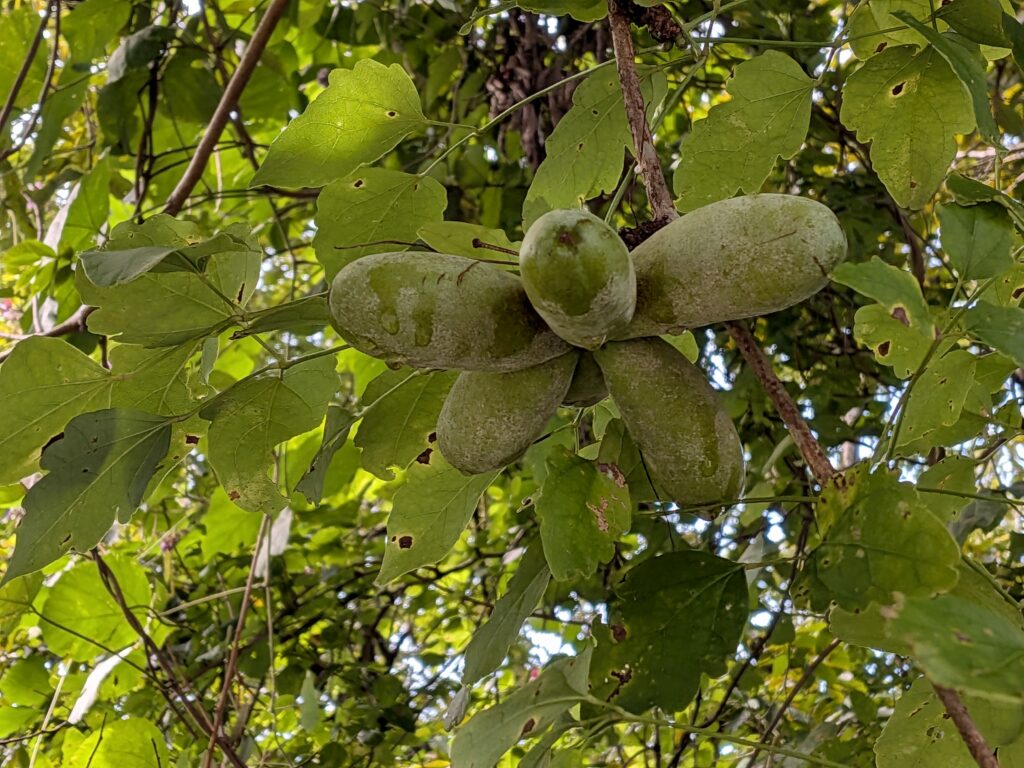 本社近くの市道の脇に、木通(あけび)の実が生っていました。