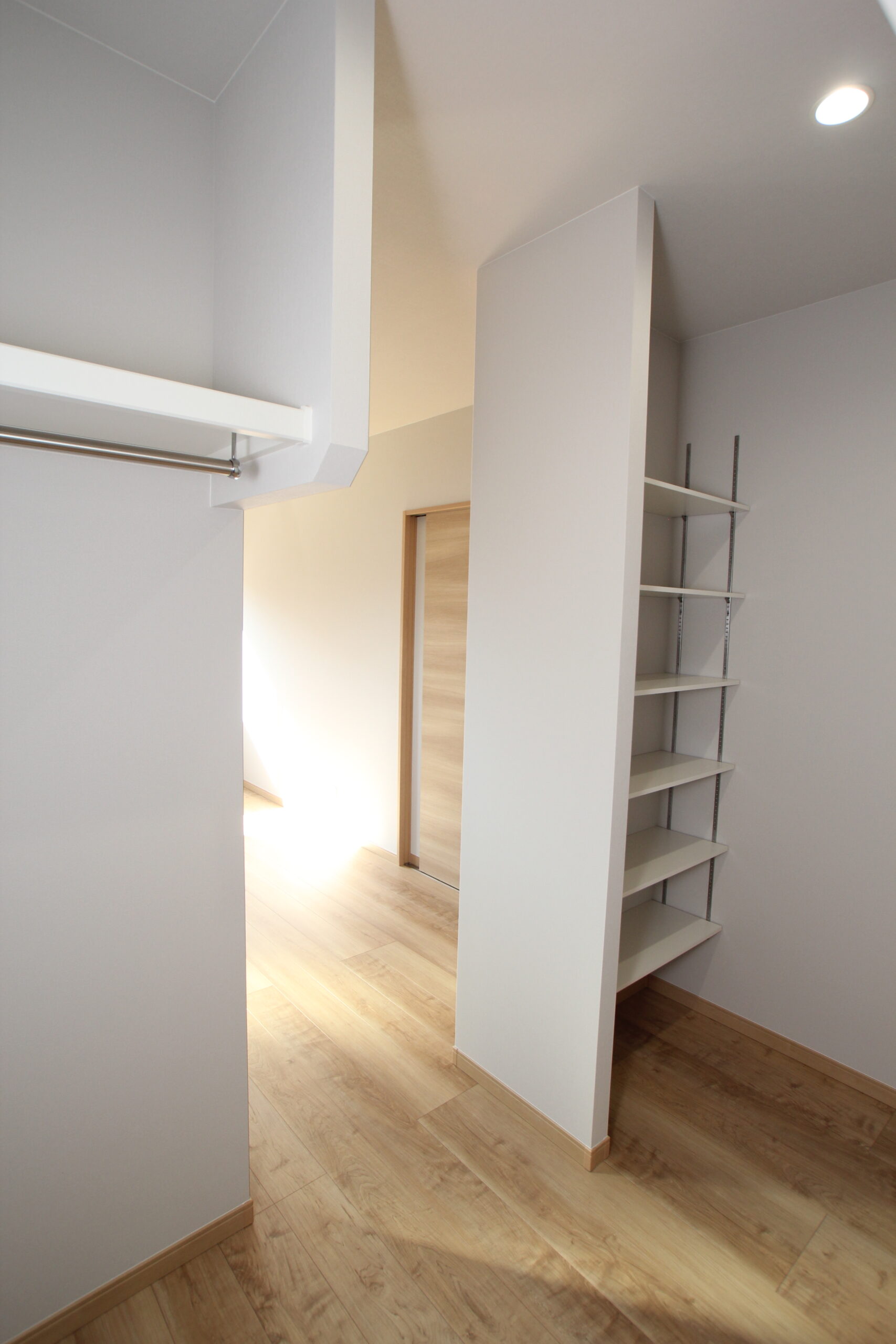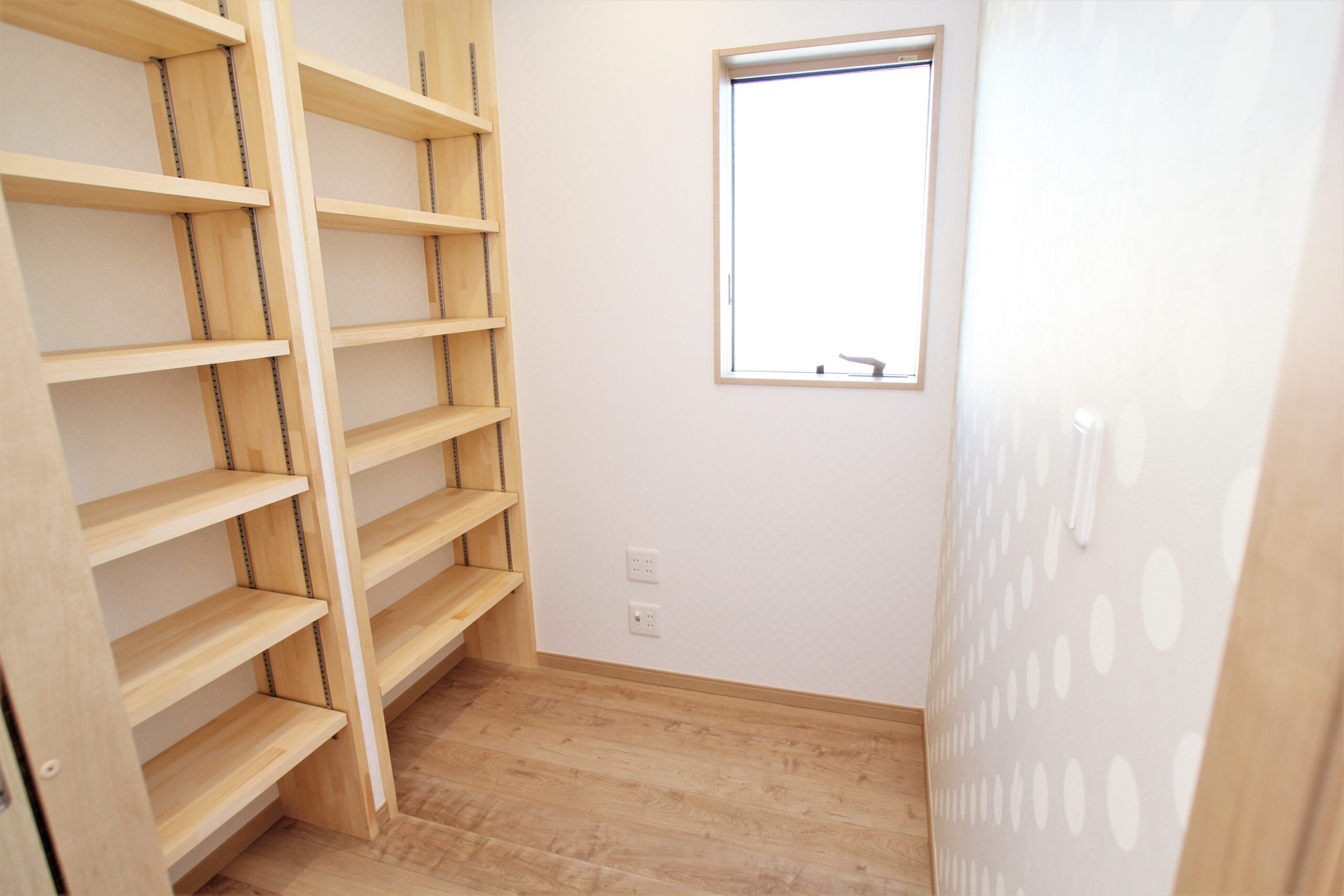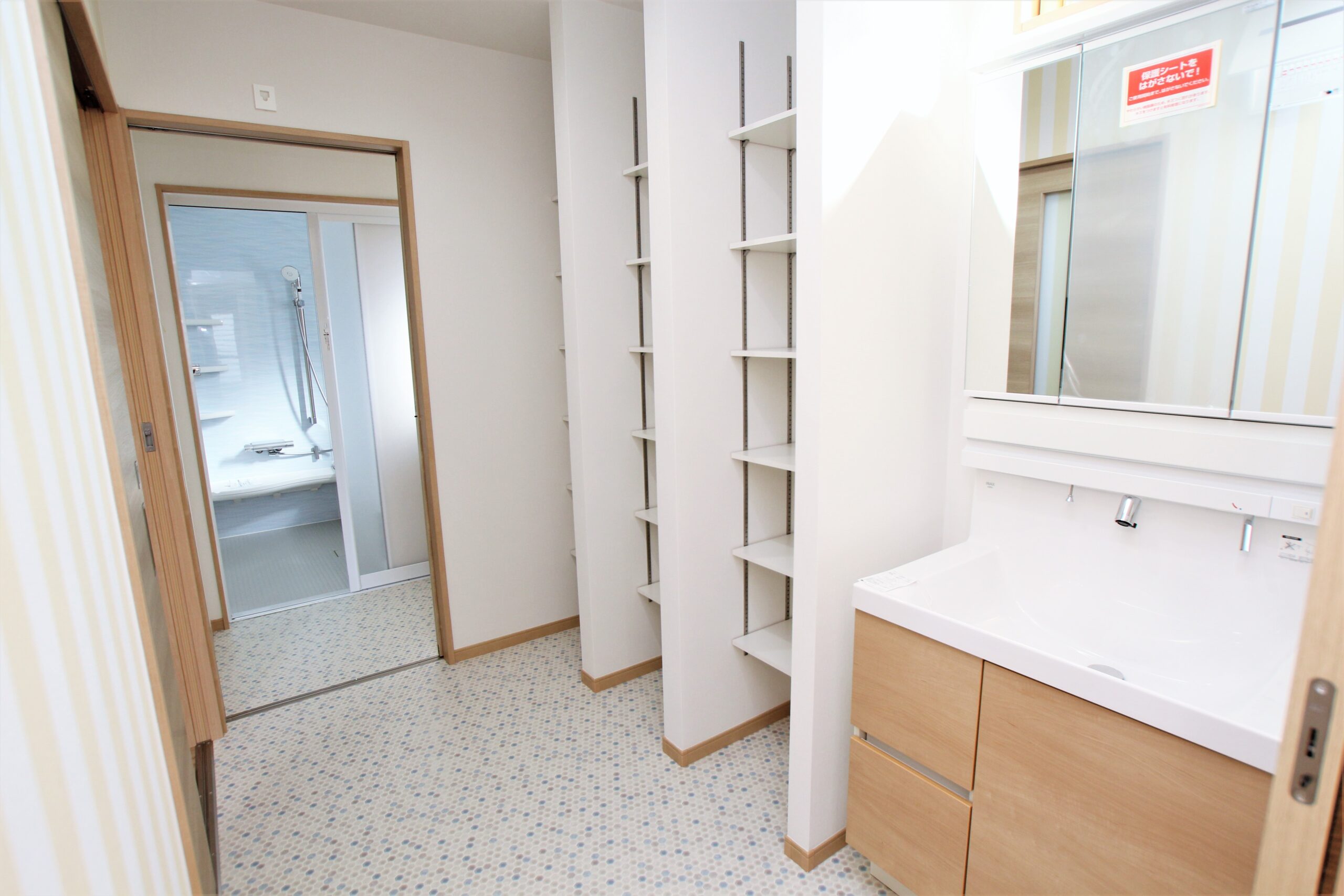 広々としたサニタリールームは大きな造作棚を設置。毎日使う着替えやタオル、ゆくゆくはお子さまのランドセルや荷物置場としても利用できるようにとのアイディアです。