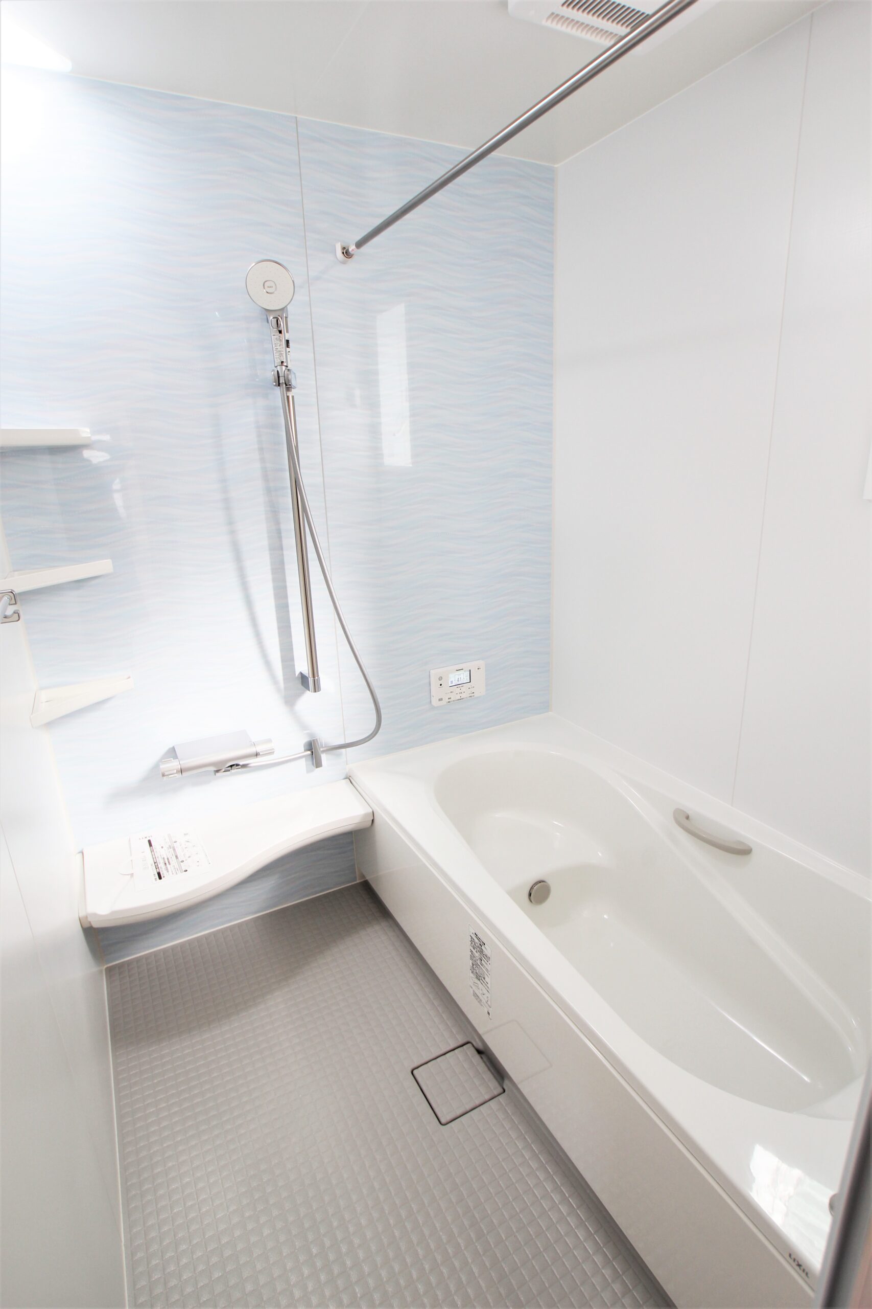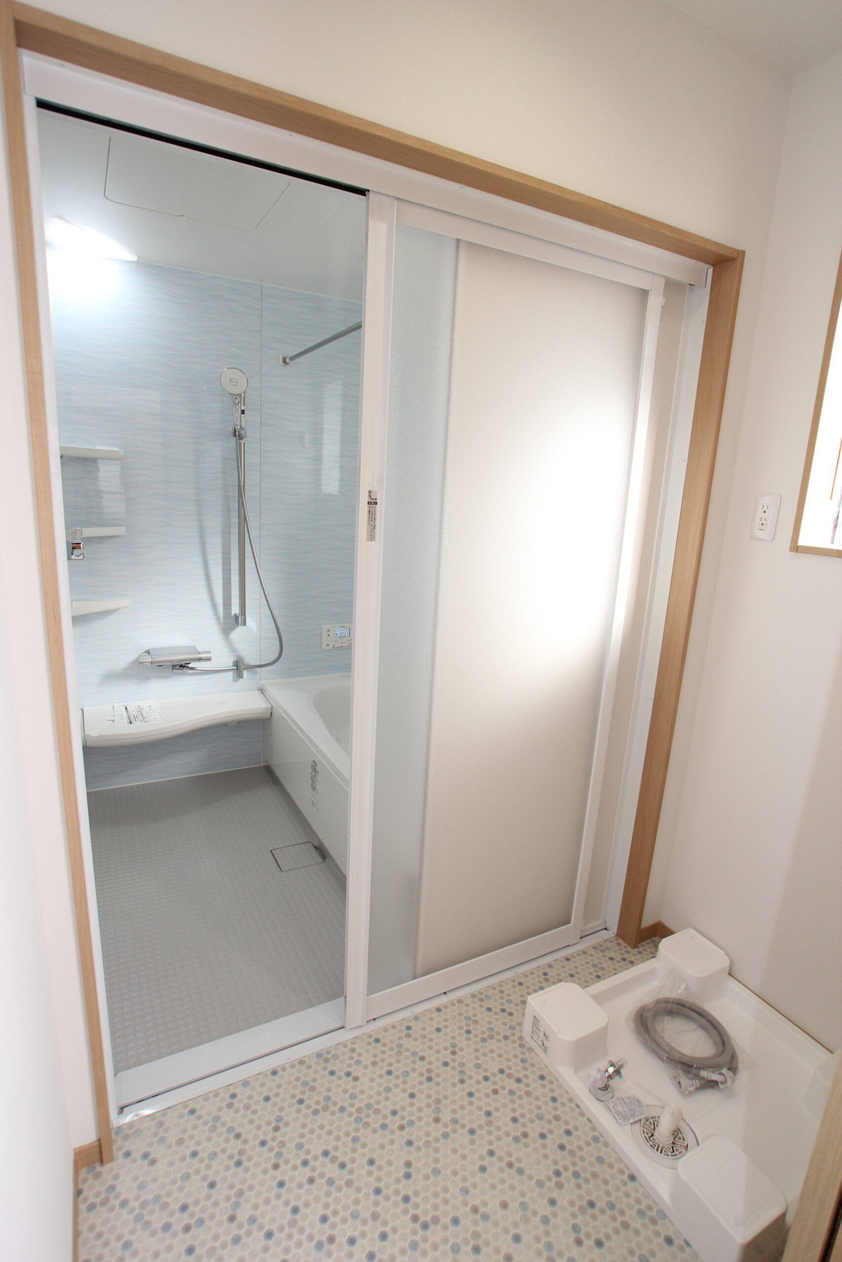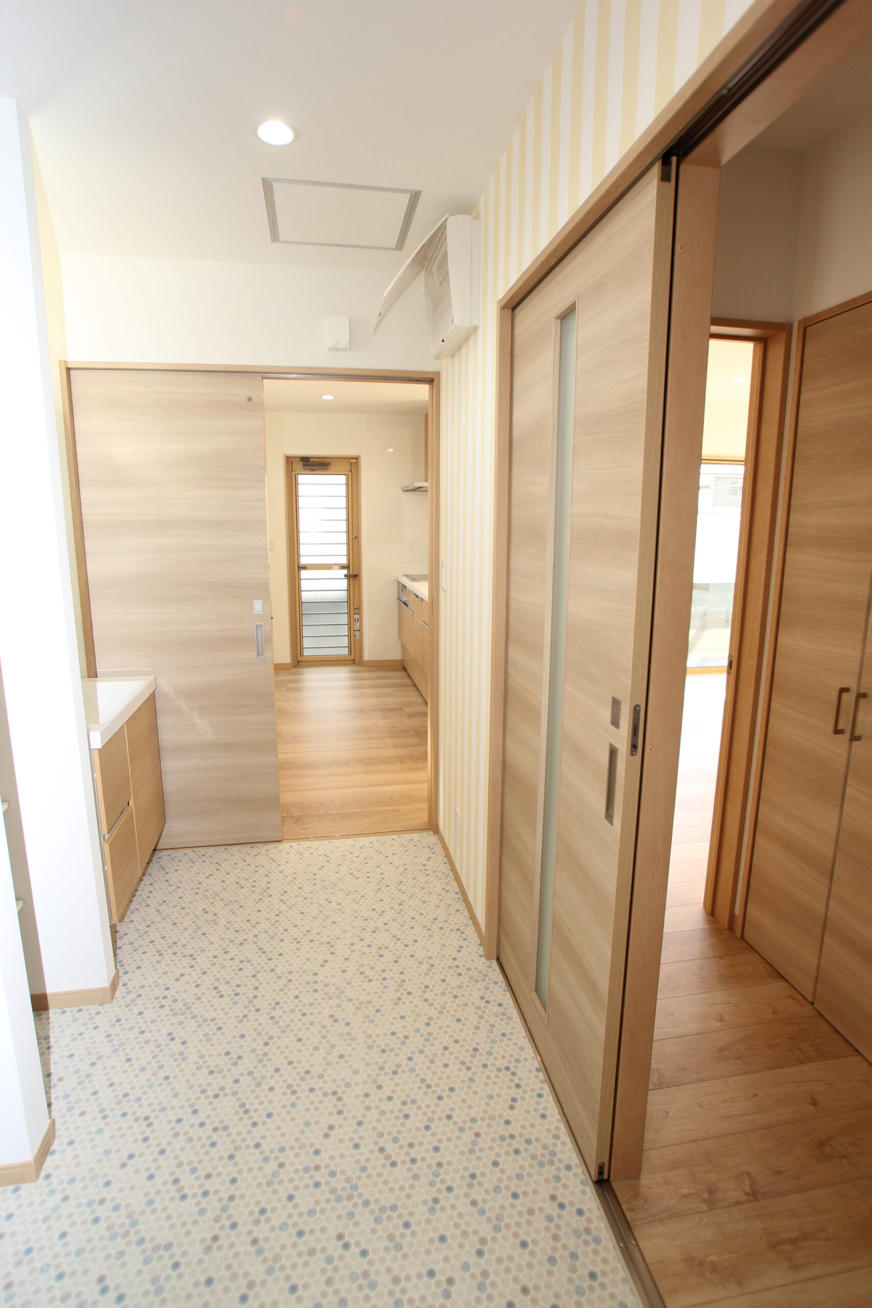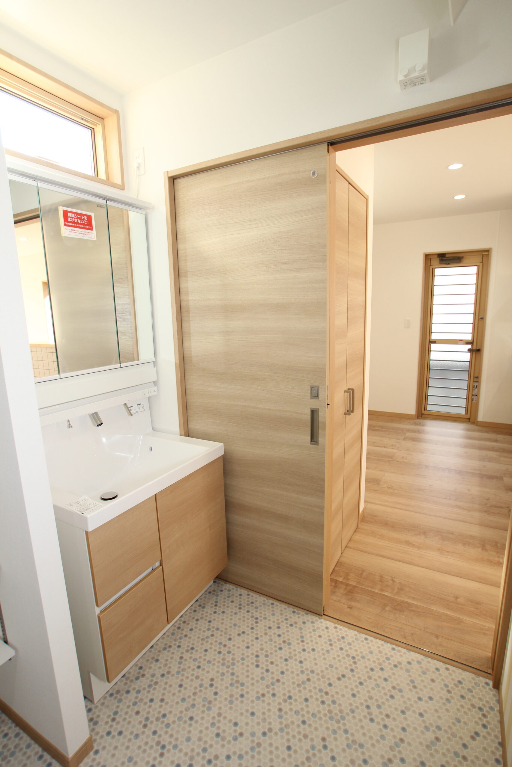 広々としたサニタリールームは大きな造作棚を設置。毎日使う着替えやタオル、ゆくゆくはお子さまのランドセルや荷物置場としても利用できるようにとのアイディアです。